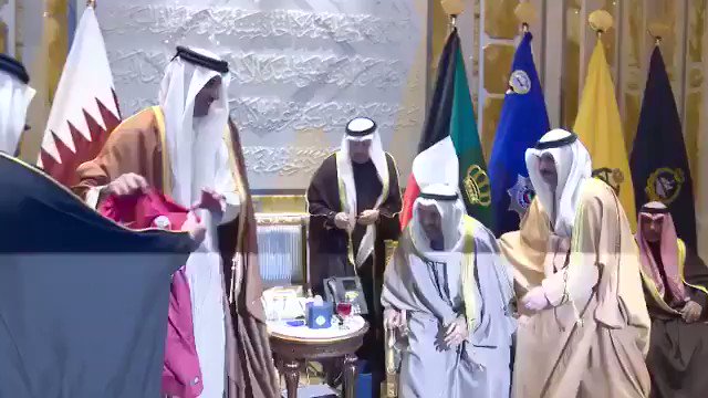 وخلال إهدائه للقميص، قال الشيخ "تميم" لأمير الكويت، إنها "هدية من عيالك اللاعبين.. كانوا دائما يذكرون الشيخ الصباح الذي كان دائما يدعمنا بكلامه وتهنئته"، ورد الشيخ "صباح": "نشوفكم في كأس العالم إن شاء الله".
