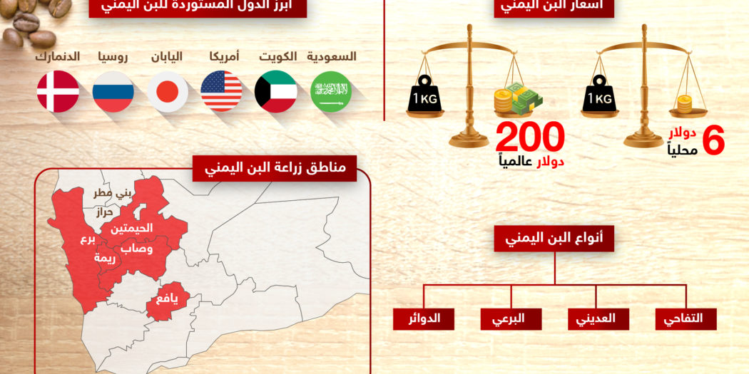 تعرف على انواع البن اليمني والدول الاكثر استيرادا واسعارة عالميا من خلال الانفجرافيك التالي :