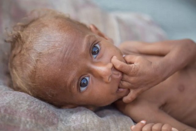خلال الأشهر الثلاثة عشر منذ ولادته ، تعرض الطفل نصير لخطر الموت الوشيك مرتين تقريبًا بسبب المجاعة في اليمن.