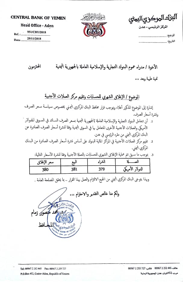 وقد خفض المركزي اليمني الدولار هذه المرة ليساوي 380 تماشيا مع سعره في محلات الصرافة.