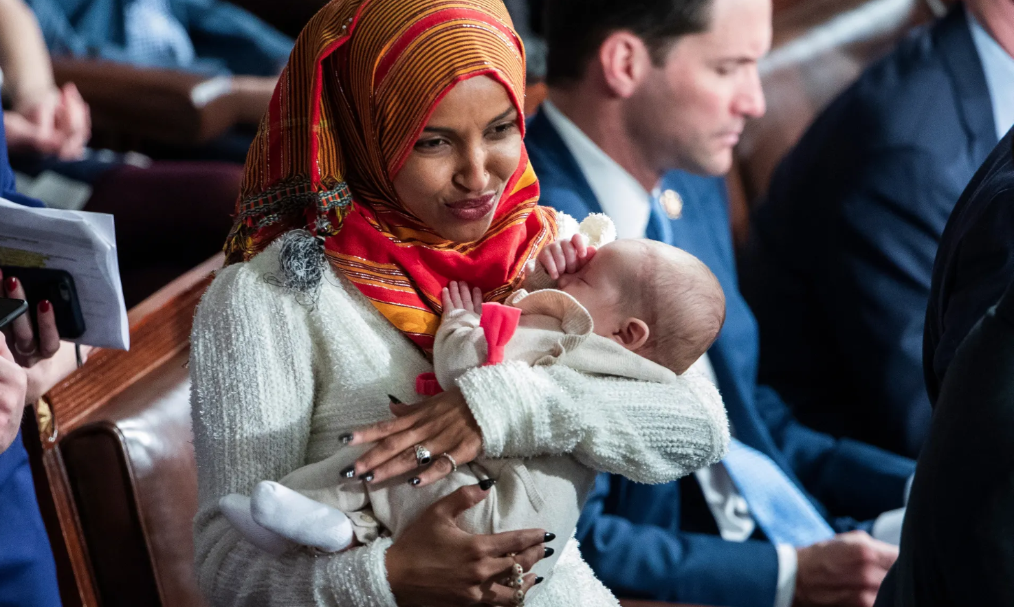 كذلك فاضت القاعة الوقورة الساكنة عادةً بأصوات الأطفال. هَدهَد عضو الكونغرس إريك سوالويل طفلته الرضيعة، كريكت، داخل قاعة مجلس النواب. ومرَّت به إلهان لتُساعده بحمل الطفلة.