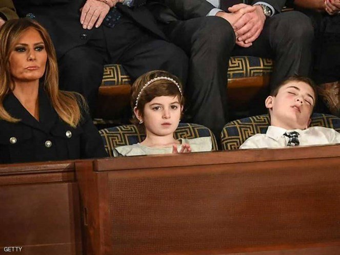 والتقطت عدسات المصورين الطفل جوشوا ترامب (11 عاما) نائما، وقد أسند رأسه إلى ظهر الكرسي، خلال خطاب ترامب عن حالة الاتحاد الذي استمر نحو ساعة و20 دقيقة.