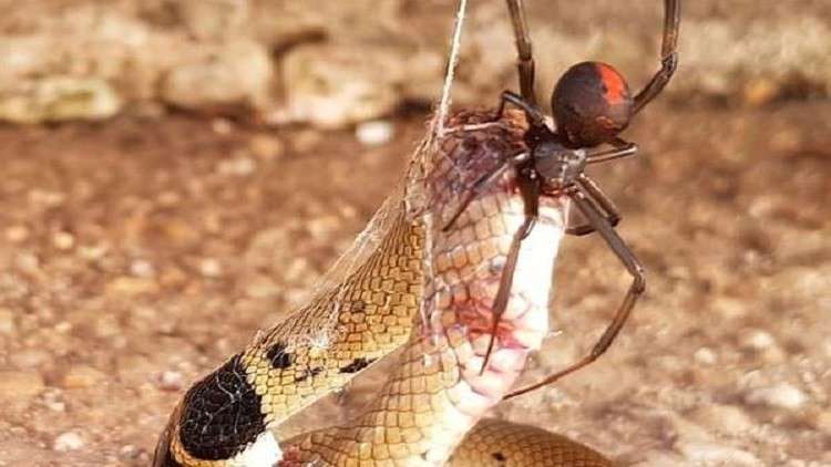 التقطت مواطنة أسترالية صورا لأغرب منظر للحياة البرية في حياتها، يرصد موت أحد أكثر الثعابين سمية في العالم على يد عنكبوت أحمر الظهر.