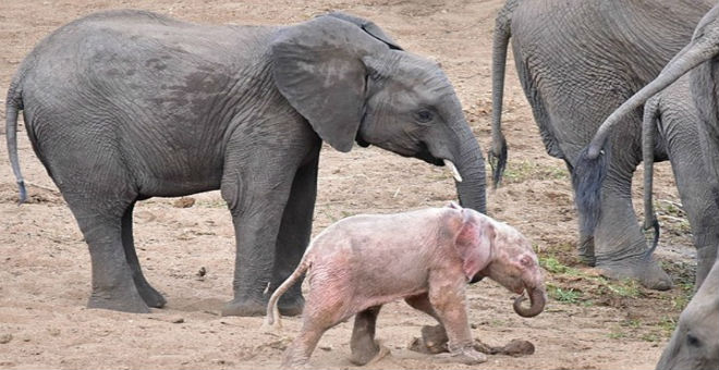 رصد مرشد سياحي لقطات نادرة لفيل وردي اللون يلهو بالقرب من عائلته.