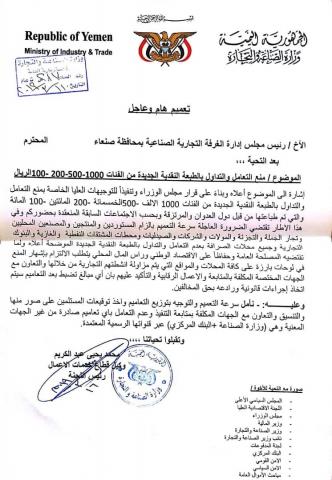 وجاء تحذير في القرار لكل من المواطنين والتجار ومحلات الصرافة والشركات والصيدليات من التعامل او التداول باي شكل مع العملات النقدية المطبوعة حديثا من قبل الحكومة الشرعية .