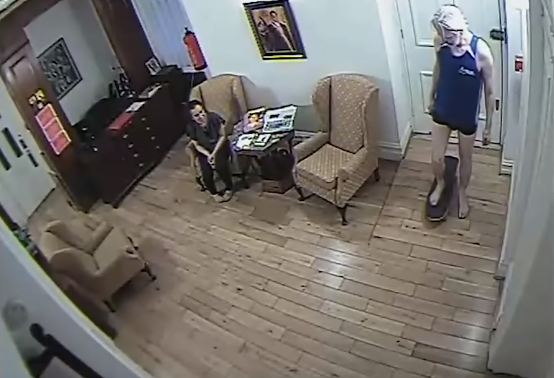 تظهر لقطات كاميرا المراقبة داخل السفارة الإكوادورية في لندن، مؤسس موقع ويكيليكس البالغ من العمر 47 عاماً وهو يتعثر على لوح للتزلج، داخل السفارة الإكوادورية في لندن أثناء لجوئه إليها لمدة 7 أعوام.
