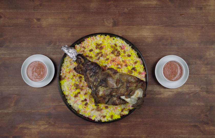 16- يوضع الأرز في صينية وفوقها فخذ اللحم ويُقدّم إلى جانب صوص المندي.