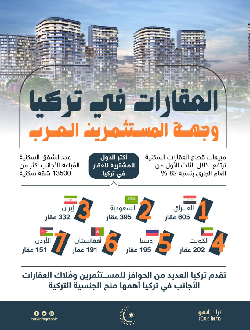 كشفت احصائية نشرتها السلطات التركية عن اكثر الجنسيات التي تستثمر في سوق العقار بتركيا.