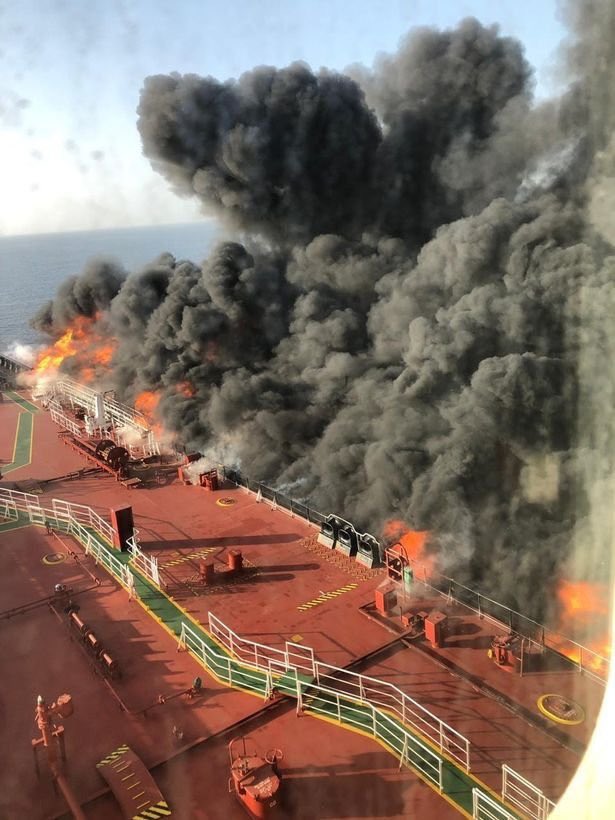 نشرت وكالات انباء صوراً اولية للحرائق المشتعلة على متن أحدى ناقلتي النفط اللتان تعرضتا لهجوم في بحر عمان.
