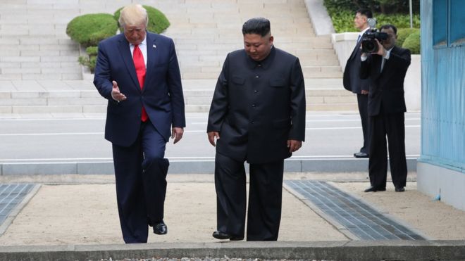 تصافح الزعيمان في اللقاء، الذي تحقق بعد أن وجه ترامب الدعوة لكيم عبر موقع التواصل الاجتماعي "تويتر"، والتقيا على الخط الحدودي الفاصل بين الكوريتين قبل أن يعبر ترامب الحدود إلى كوريا الشمالية في خطوة رمزية.