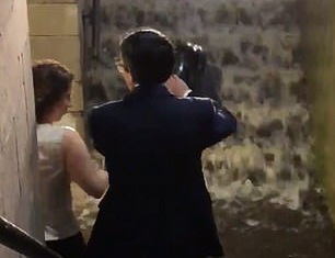 وبعدها، حملت المرأة الرجل إلى عربة القطار بينما يُمكن سماع أصوات ضحكات المارة في مكان قريب.
