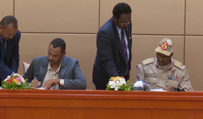 وقّع المجلس العسكري و «قوى إعلان الحرية والتغيير» في السودان، اليوم الأحد 4 أغسطس/ آب 2019، بالأحرف الأولى على وثيقة الإعلان الدستوري. ووقَّع على الوثيقة كل من نائب رئيس المجلس العسكري، محمد حمدان دقلو «حميدتي»، في حين وقّع أحمد الربيع عن «قوى إعلان الحرية والتغيير».