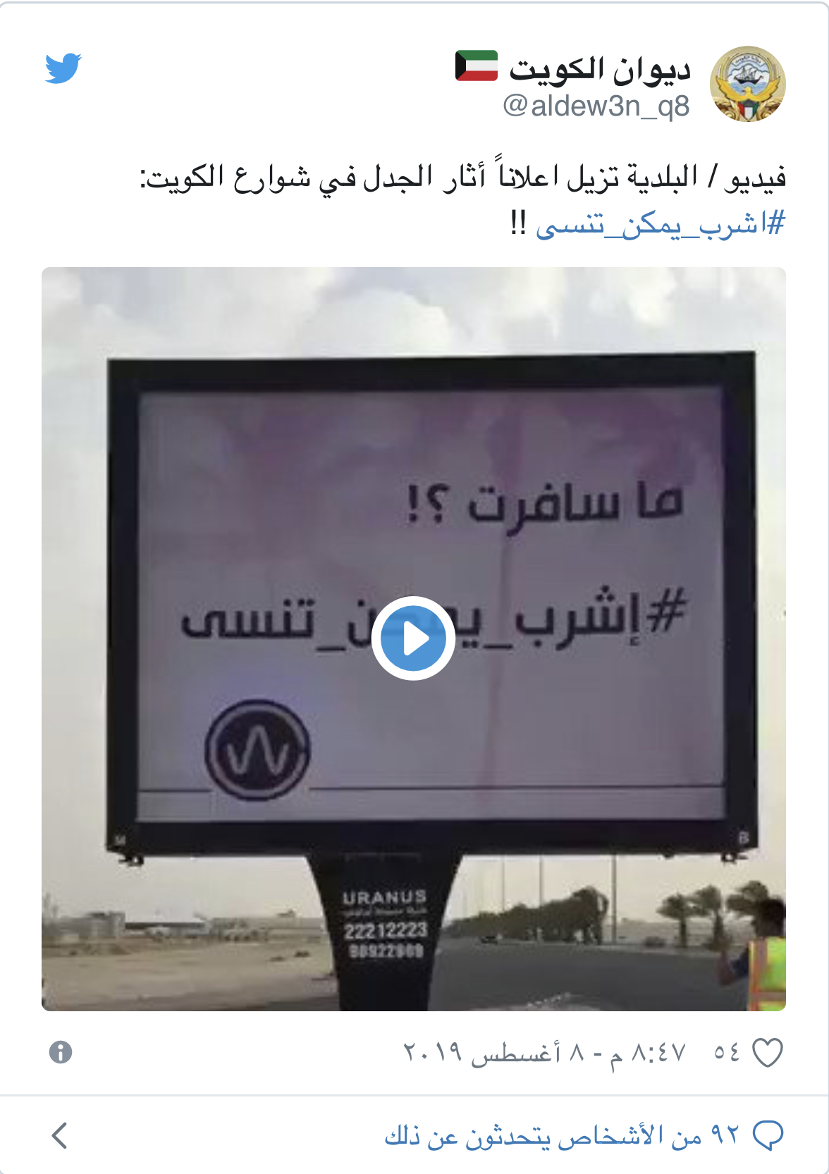وبعد الدعوات لإزالة الإعلان وتشديد الرقابة من السلطات المعنية تجاه الإعلانات المنتشرة في الشوارع، تدخلت السلطات البلدية في الكويت وأزالته.
