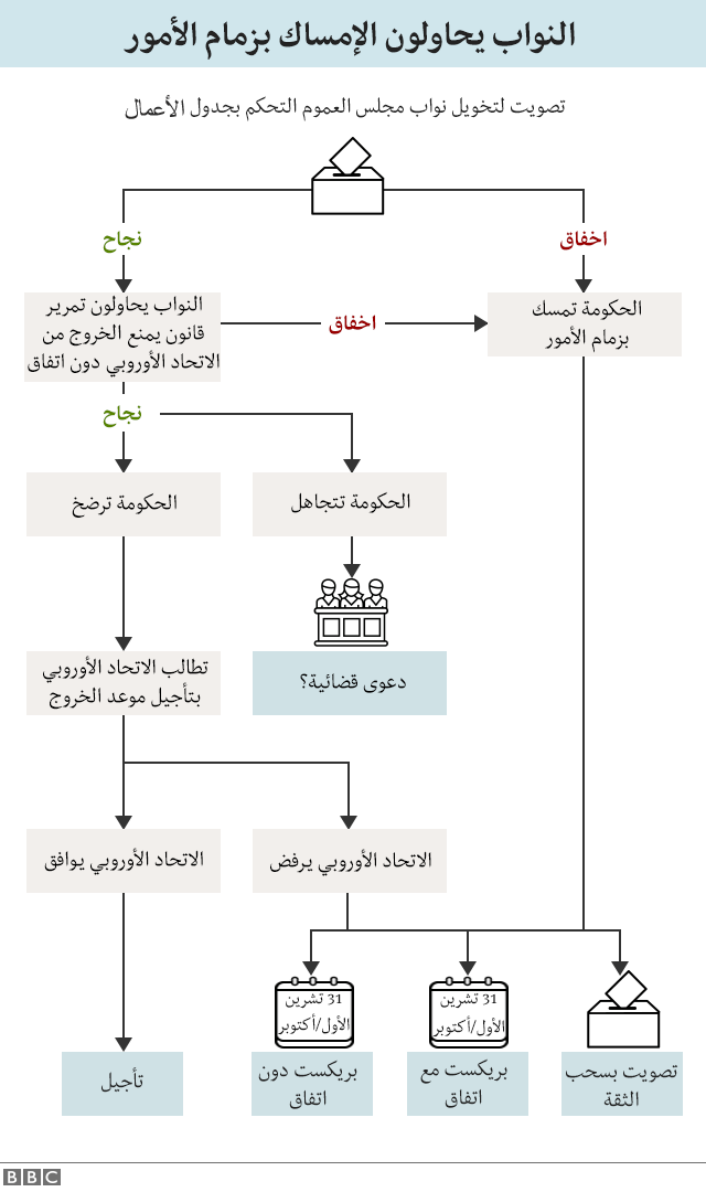 ولكن رئيس الحكومة جونسون يقول إنه ما زال يريد أن يتوصل إلى اتفاق قبل ذلك التاريخ، كما عبر العديد من نواب مجلس العموم عن تصميمهم على محاولة منع خروج بريطانيا من الاتحاد الأوروبي دون اتفاق.