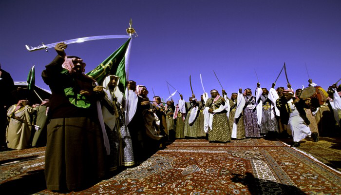 والعرضة السعودية هي إحدى رقصات الحرب المختصة بإقليم نجد (الذي تنحدر منه الأسرة الحاكمة)، دون غيره من الأقاليم، حيث تزخر القصائد الخاصة بهذه الرقصة بمديح الأسرة الحاكمة وبطولات المؤسس الملك "عبدالعزيز بن سعود"، الذي قام بتوحيد البلاد بعد حروب دموية طويلة، سيطر خلالها على أقاليم الحجاز والإحساء وعسير.