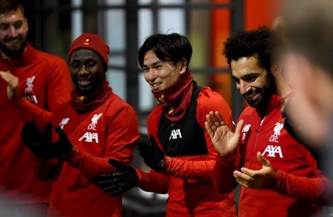 وكان صلاح غنى بالمصرية بعد غناء مدربه يورغن كلوب بالألمانية، وغناء الوافد الجديد الياباني تاكومي مينامينو بلغته الأم.