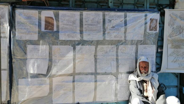 بين حين وآخر، يتوقف المارّة ليقرؤوا بفضول ما وسعهم من تفاصيل قصة معاناة طويلة، مبثوثة على ما يقارب خمسين مخطوطة ورقية من القطع الكبير والمتوسط. وبالقرب منها، دائما، يوجد الرجل الذي غزا الشيب شعره ولحيته، للتوضيح والإجابة على الاستفسارات.