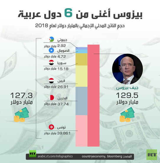 من ناحية أخرى تفوق ثروة بيزوس (129.5 مليار دولار) مجموع الناتج المحلي لـ 6 دول عربية مجتمعة (127.3 مليار دولار) وهي تونس، البحرين، اليمن، سوريا، الصومال و جيبوتي مجتمعة.