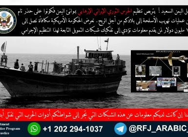 وكتب البرنامج على حسابه قائلاً: "يا أهل اليمن السعيد! يتربص تنظيم الحرس الثوري الإيراني الإرهابي بموانئ بلادكم، لهذا تعرض الحكومة الأمريكية مكافأة تصل إلى 15 مليون دولار لمن يقدم معلومات تؤدي إلى تفكيك شبكات التهريب و التمويل التابعة لهذا التنظيم الإجرامي".