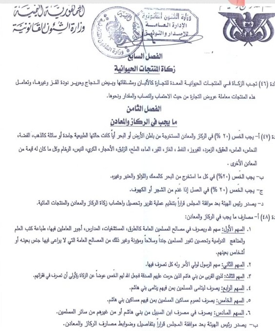 وأصدرت جماعة الحوثي رسميا قانونا معدلا للزكاة (الركاز) يتيح لأسرة الحوثي (بنو هاشم) الاستيلاء على 20% مما يملكه المواطن بحجة الخُمس.
