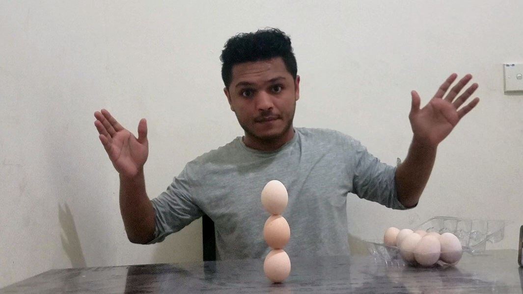 ونجح المحترف اليمني في فن التوازن بموازنة ثلاث حبات بيض بشكل طولي، فوق بعضها الأمر الذي مكنه من الوصول الى العالمية.
