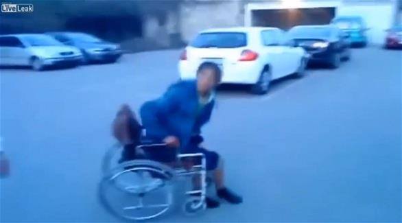 ويظهر مقطع الفيديو الذي تناقلته مواقع التواصل الاجتماعي رجلاً يهاجم رجلاً مشلولاً يجلس على كرسي متحرك، ويلقي به أرضاً، على الرغم من أنه يظهر وكأن ساقيه مبتورتان من الركبتين.