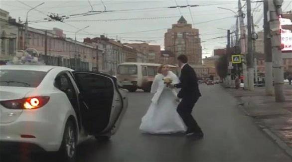 لم تنتظر عروس روسية طويلاً لتخوض أول شجار لها مع زوجها بعد الزواج، حيث خرجت غاضبة من السيارة التي كانت تقلهما في موكب الزفاف.