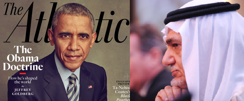 أفحم رئيس الاستخبارات السعودية الأسبق الأمير تركي الفيصل، الرئيس الأمريكي "أوباما"، عبر مقاله "لا.. يا سيد أوباما"، مذكراً إياه بضربة الملك عبدالله، رحمه الله، على طاولة لقائهما الأخير، قائلاً: "لا خطوط حمراء منك"، ذلك رداً على حديث الرئيس الأمريكي الذي نقلته مجلة "ذا أتلانتك" تحت عنوان: "عقيدة أوباما" والذي تطرق فيه للسعودية، ونقلته الصحف العالمية تحت عنوان: "أوباما يهاجم السعودية ويكره العرب"؛ حيث أثار حديث "أوباما" موجة من السخرية بين المسلمين في الولايات المتحدة والدول الإسلامية؛ بينما لاقى مقال الأمير تركي استحسان العرب والمسلمين؛ لما جاء به من حقائق عن الرئيس الأمريكي.