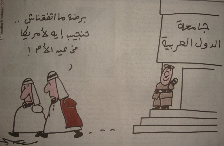وفي الرسم تبدو جامعة الدول العربية إلى اليمين، وإلى جوارها رجل أمن مصري يحرسها، بينما خرج منها للتو مسؤولان خليجيان يرتديان الملابس الخليجية التقليدية، وقد دار بينهما حديث، يقول فيه أحدهما للآخر: "برضه ما اتفقناش.. حنجيب إيه لأمريكا في عيد الأم؟".
