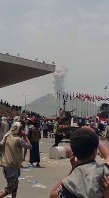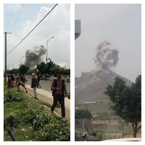 وشوهدت جموع المحتشدين تفر من الهلع والذعر بعد غارة لطيران التحالف على دار الرئاسة.