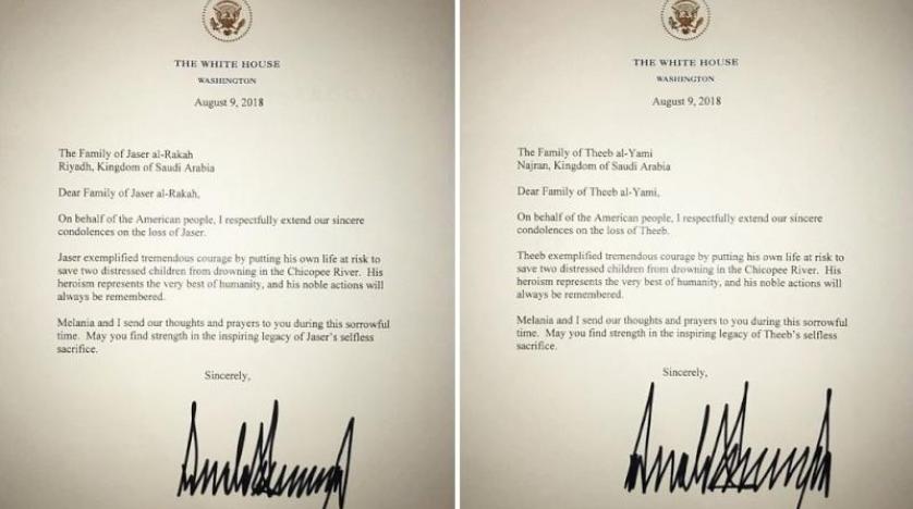 بعث الرئيس الأمريكي "دونالد ترامب" برقيتي عزاء ومواساة إلى عائلتي الطالبين السعوديين اللذين لقيا حتفهما غرقاً أثناء محاولتهما إنقاذ طفلين أمريكيين من الغرق.
